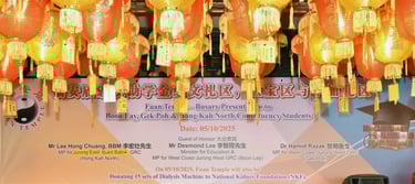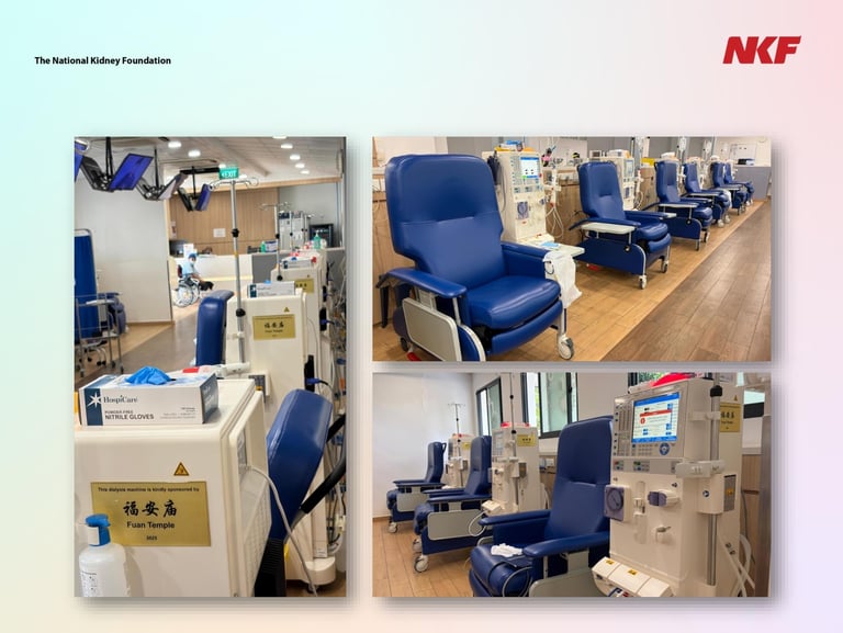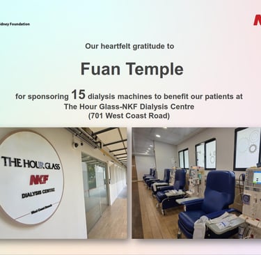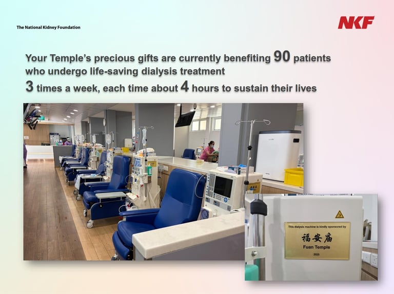 在本庙持续的支持下,共捐赠15 台透析机,为依赖透析治疗维持生命的肾病患者提供重要的生命支持。这批透析机已安置于位于西海岸路第701座的 Hour Glass–NKF 透析中心,每台机器上均附有本庙名称的铭牌,以示感谢。此项捐赠预计在八年内惠及约 90 名肾病患者,为他们带来持续的关怀、生命与希望。