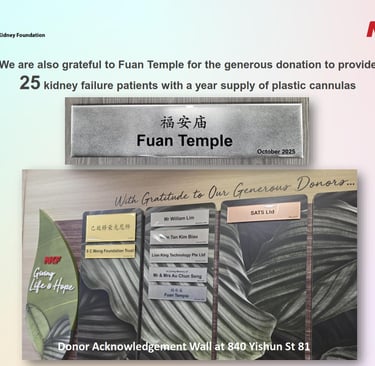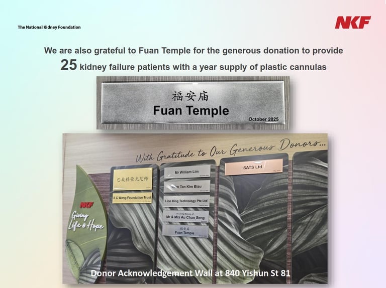 此外,本庙亦慷慨捐助夜间透析所使用的软性塑料套管针(Plastic Cannulas),以提升夜间透析患者的安全性与舒适度。作为致谢,国立肾脏基金会已在位于义顺81街第840座、由新加坡承包商协会(SCAL)支持的 NKF 透析中心的捐赠鸣谢墙上,设置刻有本庙名称的鸣谢铭牌。
