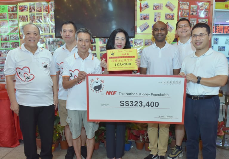 In addition, the temple has also contributed towards the provision of plastic cannulas (soft plastic needles) used for overnight dialysis treatments. This support helps enhance patient safety and comfort during night dialysis sessions. In appreciation, a donor acknowledgment bearing the temple’s name has been displayed on the donor recognition wall at the NKF Dialysis Centre supported by The Singapore Contractors Association Ltd (SCAL), located at Block 840 Yishun Street 81.
